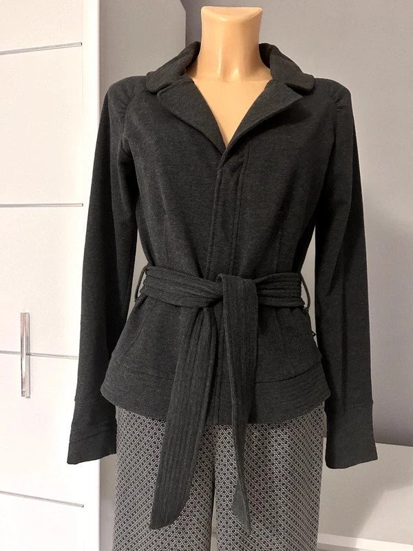 Marynarka, żakiet bawełna z elastanem firmy premium Gestuz - cena sklepowa około 2000 zł. Kolor ciemnoszary, z elastanem, więc bardzo wygodna. Kobiecy fason, marszczona na ramionach, z paskiem podkreślającym talię, zapinana na zatrzaski. Wykonana z dbałością o szczegóły z miękkiego, miłego matriału, cieplutki puszek w środku. Old money style, szafa kapsułowa. Polecam