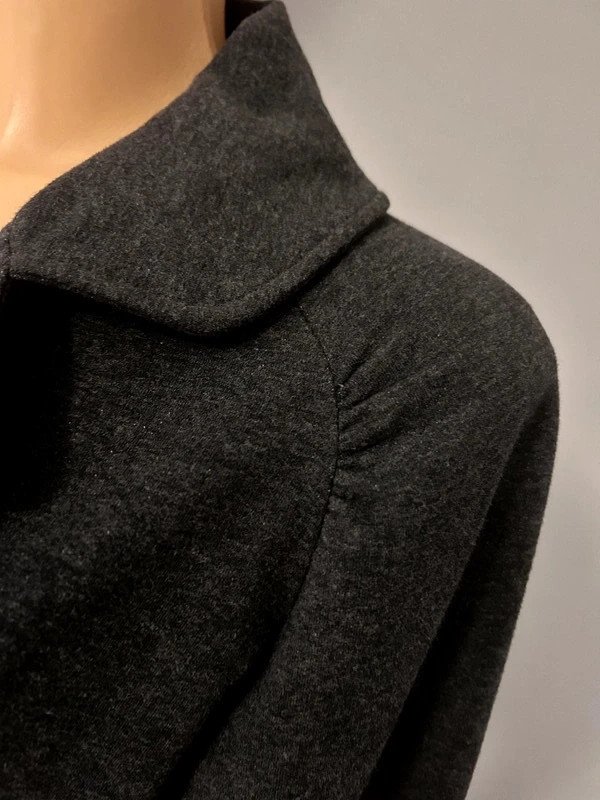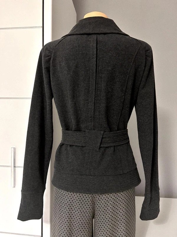 Marynarka, żakiet bawełna z elastanem firmy premium Gestuz - cena sklepowa około 2000 zł. Kolor ciemnoszary, z elastanem, więc bardzo wygodna. Kobiecy fason, marszczona na ramionach, z paskiem podkreślającym talię, zapinana na zatrzaski. Wykonana z dbałością o szczegóły z miękkiego, miłego matriału, cieplutki puszek w środku. Old money style, szafa kapsułowa. Polecam