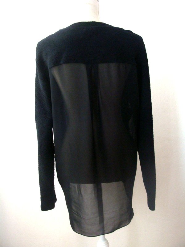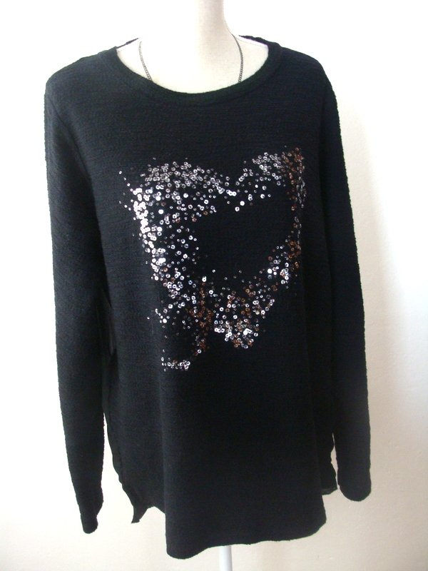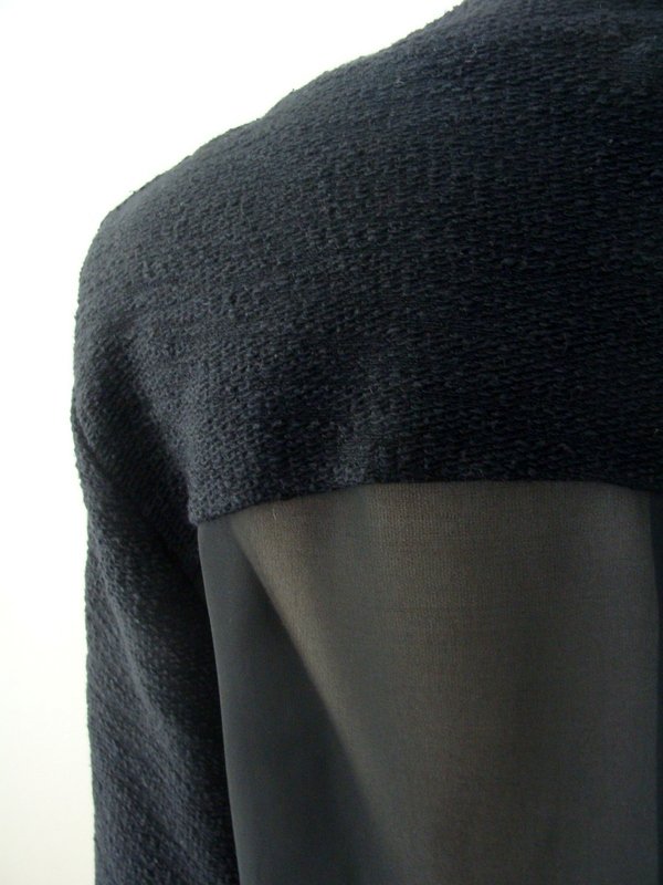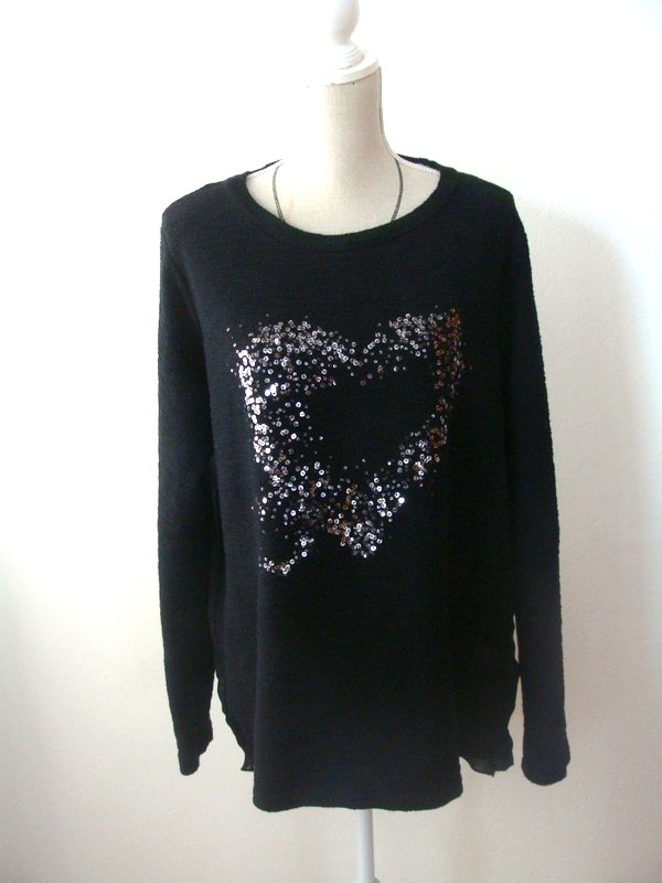Bluzka z łączonych materiałów; przód , rękawy i karczek z tyłu z bawełnianej tkaniny dzianinowej a' la frotte, tył z lekko transparentnej tkaniny poliestrowej, z kontrafałda biegnącą od karczka. Z przodu dwa cekinowe serduszka. Asymetryczna - z dłuższym tyłem.