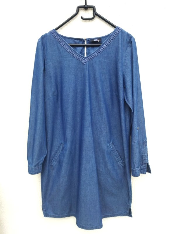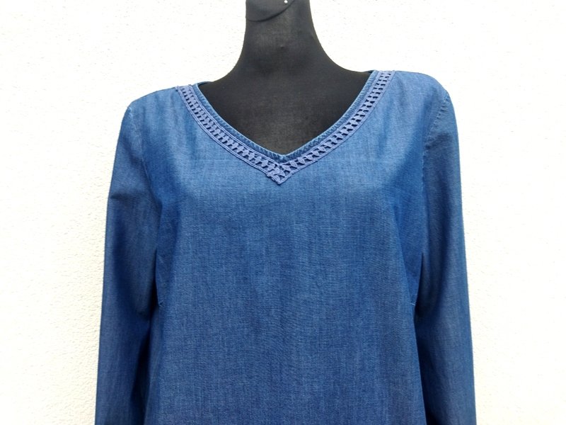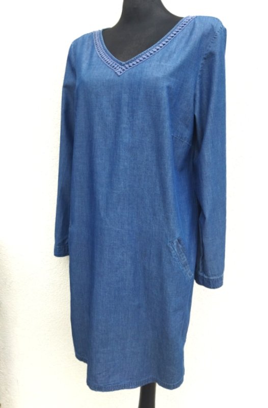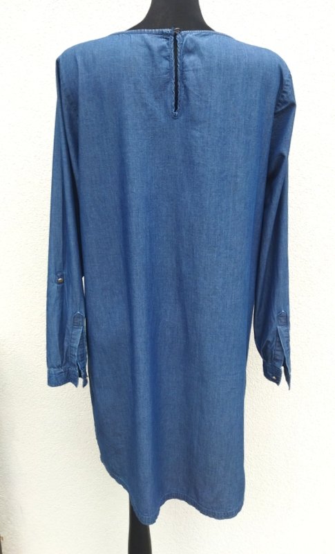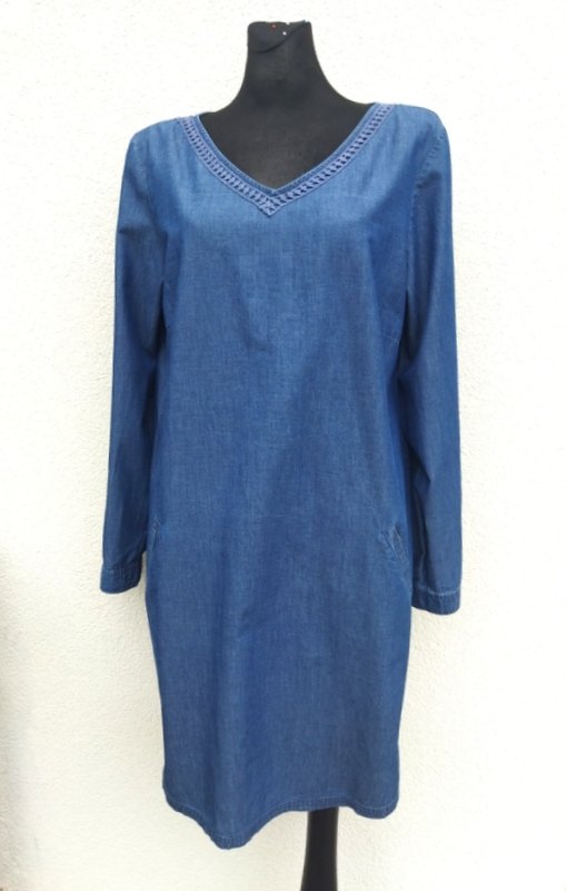 Sukienka z cienkiej jeansowej tkaniny bawełnianej w ciemnoniebieskim kolorze. Minimalistyczny krój z z dekoltem w szpic obszytym wąska pasmanterią , z dwiema wpuszczanymi kieszeniami, z małymi rozcięciami po bokach, rękawy z możliwością podpięcia .