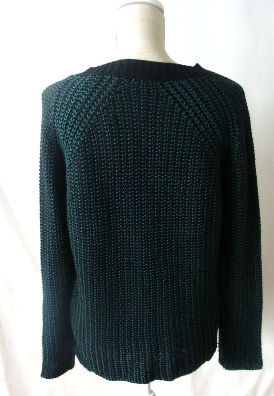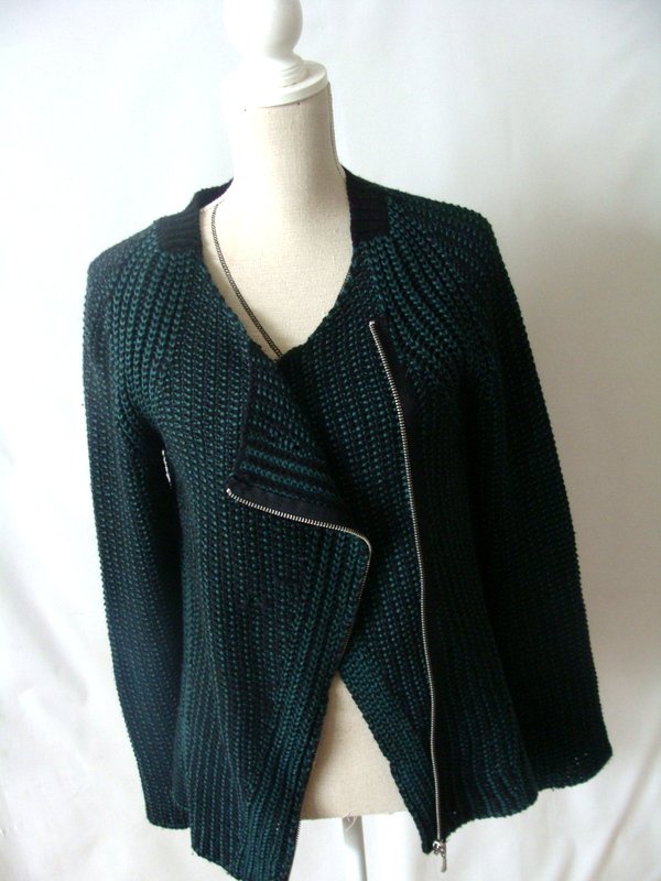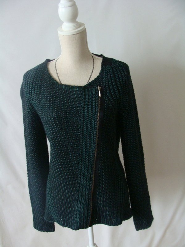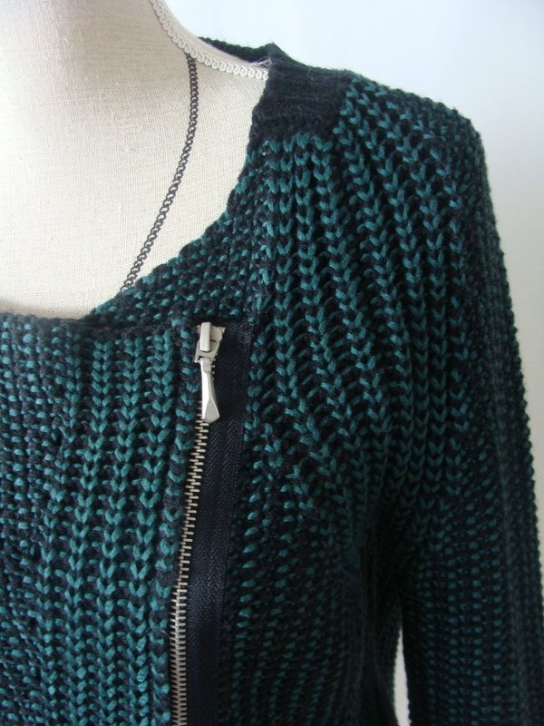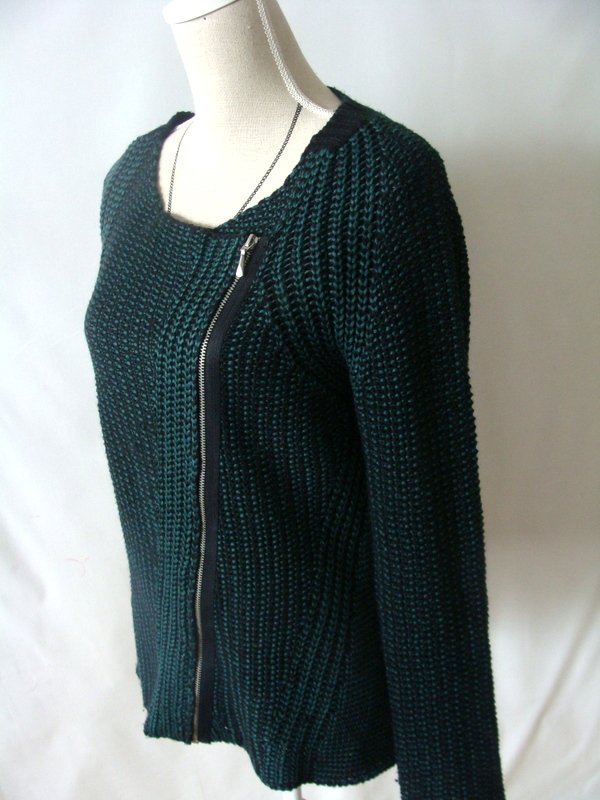 Zgrabny sweter typu kardigan w zielono- czarnym kolorze, z asymetrycznym zapięciem na zamek błyskawiczny. Rękawy raglanowe. Może służyć również jako żakiet.