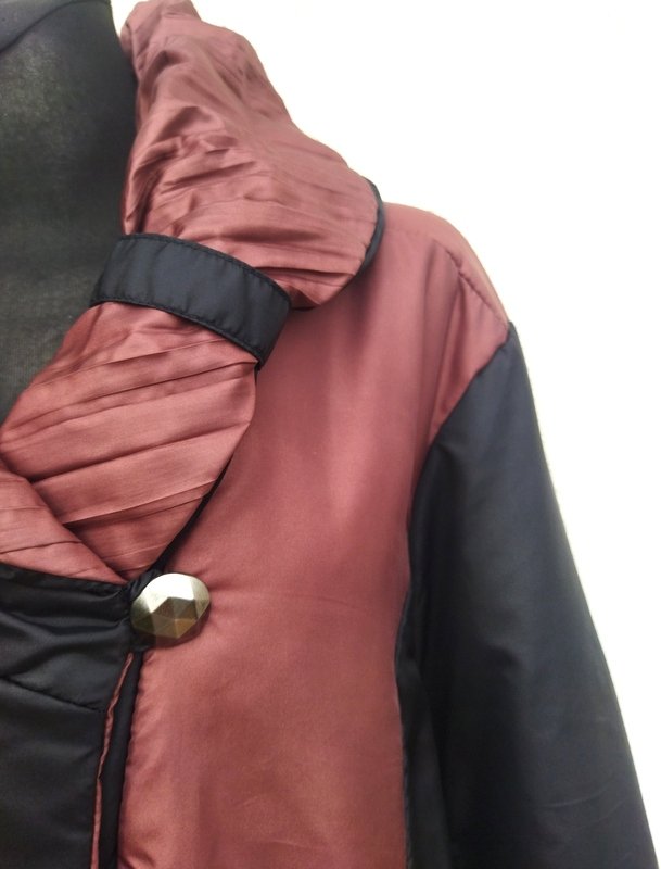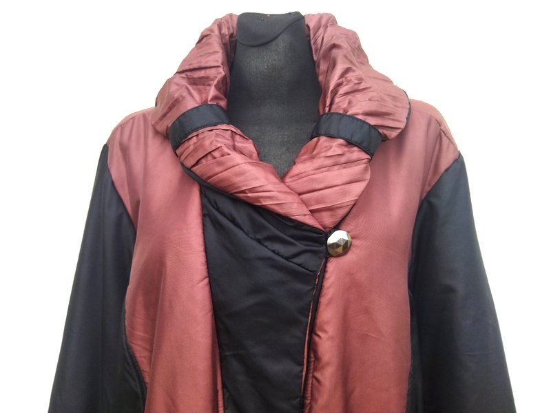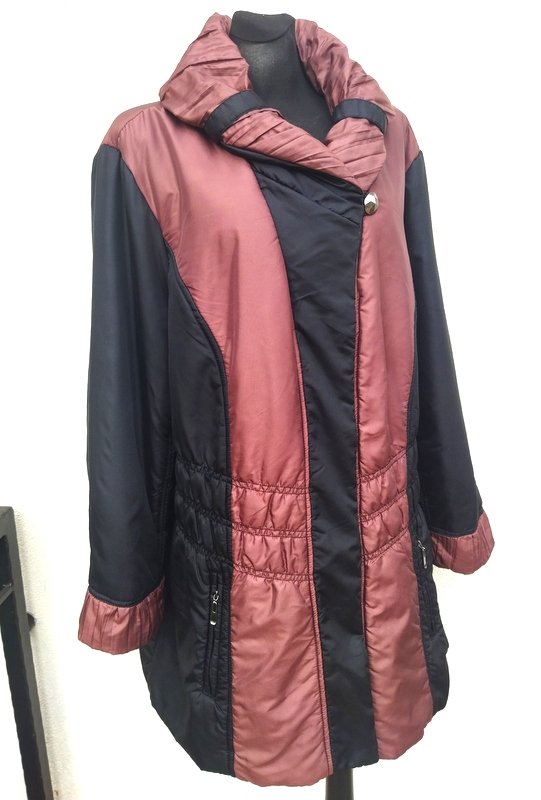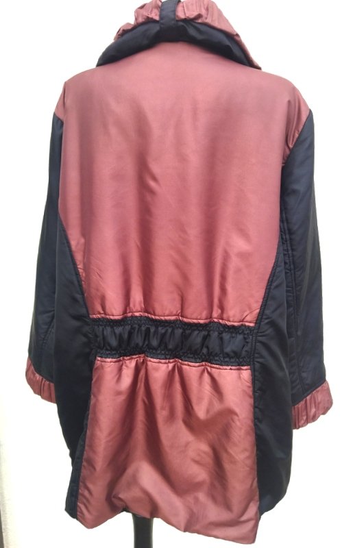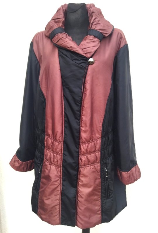Ocieplana dłuższa kurtka lub płaszcz z łączonych tkaniny w czarnym i kasztanowym kolorze. Modelowana wszywanymi gumkami , drapowany kołnierz , dwie wpuszczane kieszenie z zamkami. Zapinana z przodu na kryty zamek i napy , od strony zewnętrznej u góry na jeden ozdobny metalowy guzik. Całość na podszewce , wypełnienie poliestrowe. Miła i niezwykle lekka