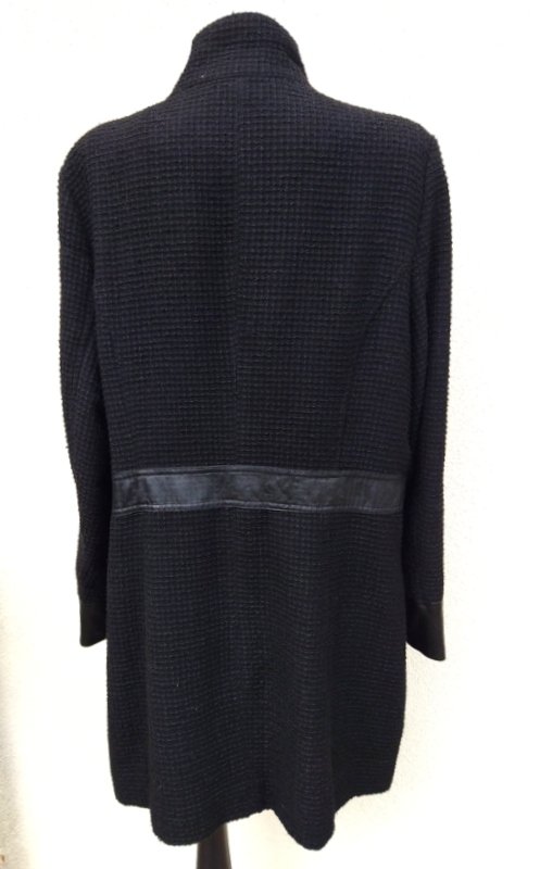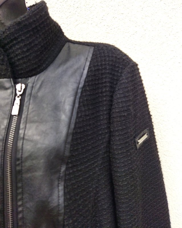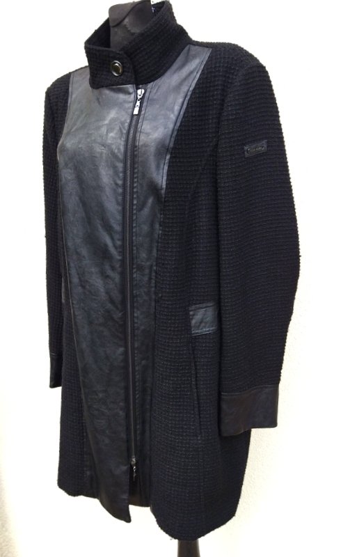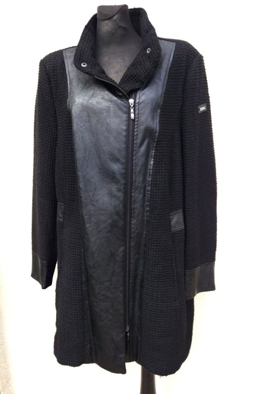 Przejściowy płaszcz z poliestrowej tkaniny z wyrazistą fakturą w czarnym kolorze z wstawkami i elementami wykończeniowymi z czarnej skóry ekologicznej. Lekko taliowany , z dwiema wpuszczanymi kieszeniami z zamkami. Zapinany na całej długości na dwustronny zamek. Całość na podszewce.