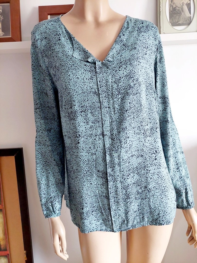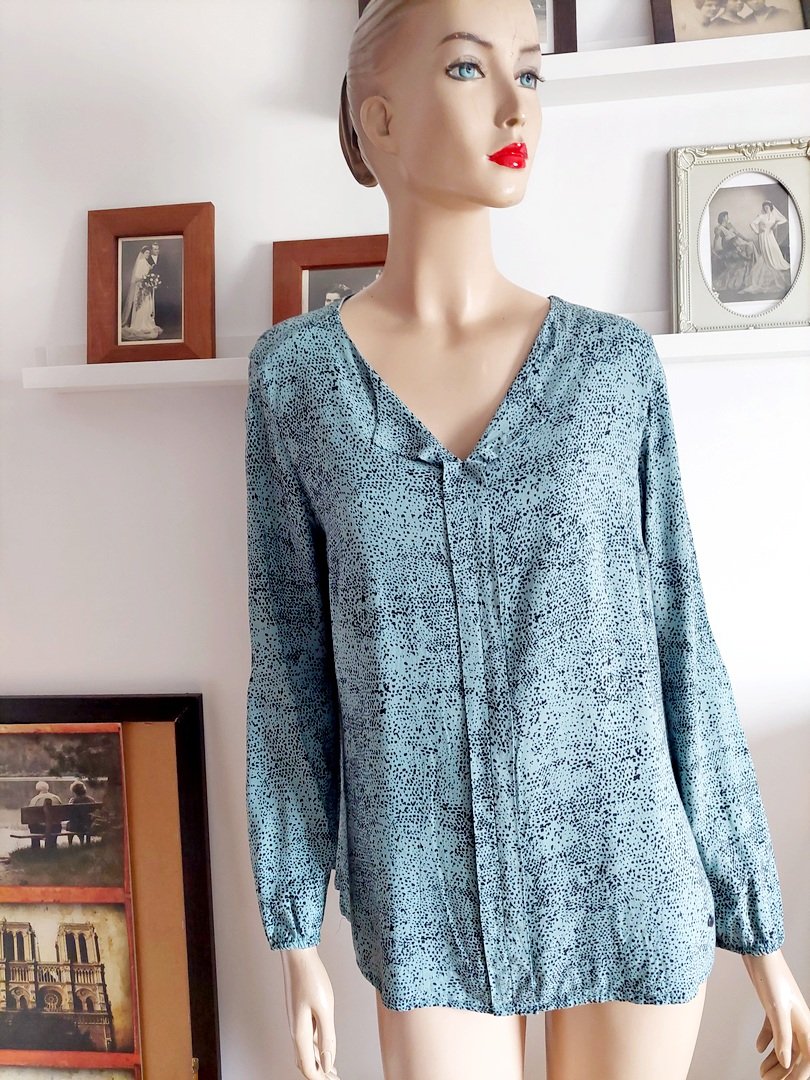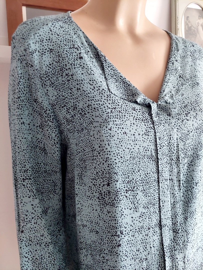 bluzka marki gina laura , kolor miętowy? z czarnym wzorem. materiał 100% wiskoza. fason prosty. Rozmiar z metki M, ale większa. na manekinie małe 38. stan bardzo dobry. proszę sprawdzić wymiary