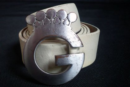 Pasek uszyty z grubej skóry pomalowanej na biało. Ozdobna - duża -metalowa klamra z logo.Zapinany na bolec.