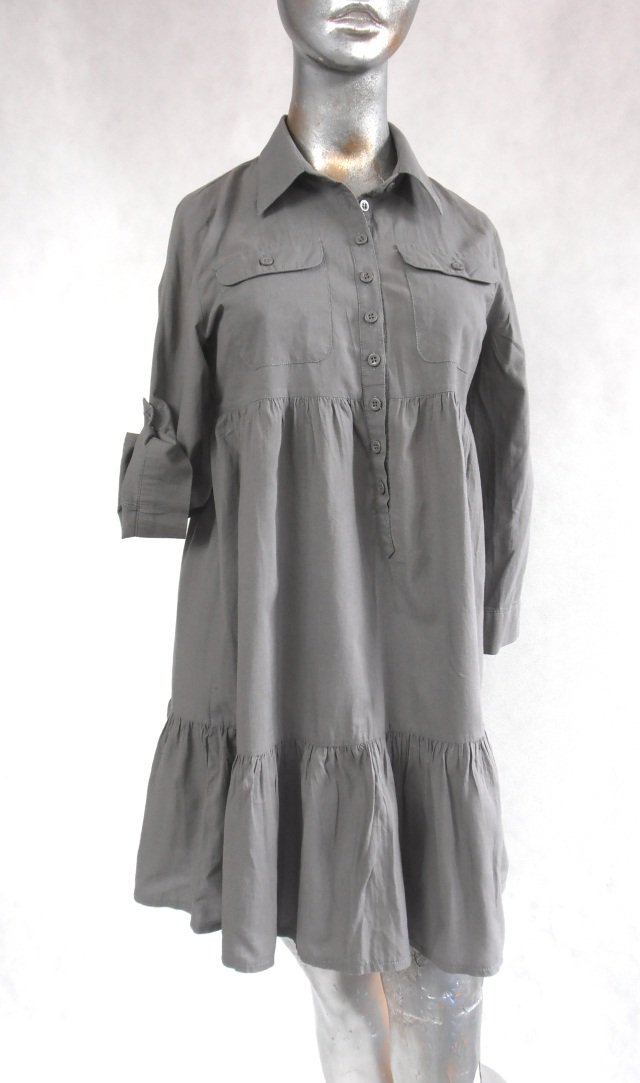 Letnia sukienka firmy ginatricot.Rozmiar 34.Materiał bawełna.Góra odcieta z rozcięciem zapiętym na guziki.Kołnierzyk na stójce.Na piersiach naszyte kieszenie z klapką zapiętą na guzik.Rękaw 3/4 w dwóch wersjach-zakończony mankietem na guzik lub podpinany paskiem na guzik.Dół marszczony,zakończony falbaną.Stan dobry+pod pachami lekkie odbarwienie..Długość 84 cm.pod pachami 92 cm.