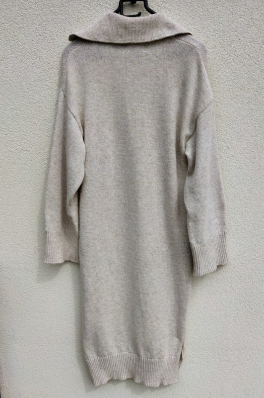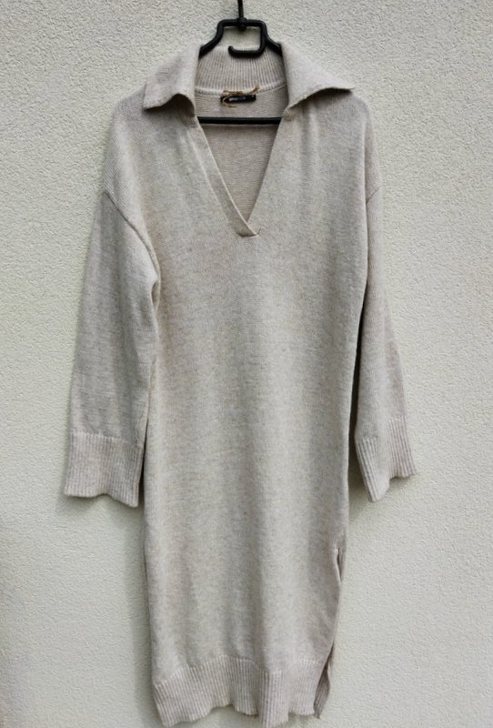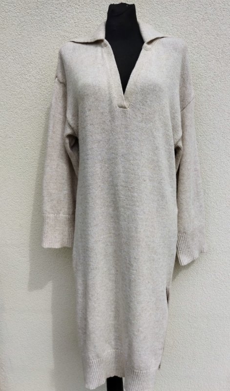 Dzianinowa sukienka o minimalistycznym uniwersalnym kroju w melanżowej kolorystyce jaśniutkiego chłodnego beżu. Z kołnierzykiem, z dekoltem V , z rozcięciami po bokach. Wykończona ściągaczami. Miła podatna i rozciagliwa