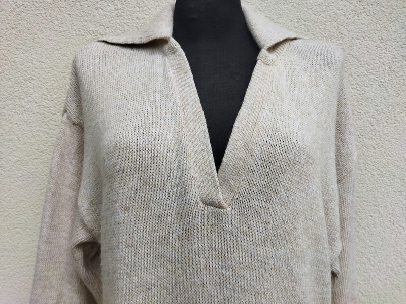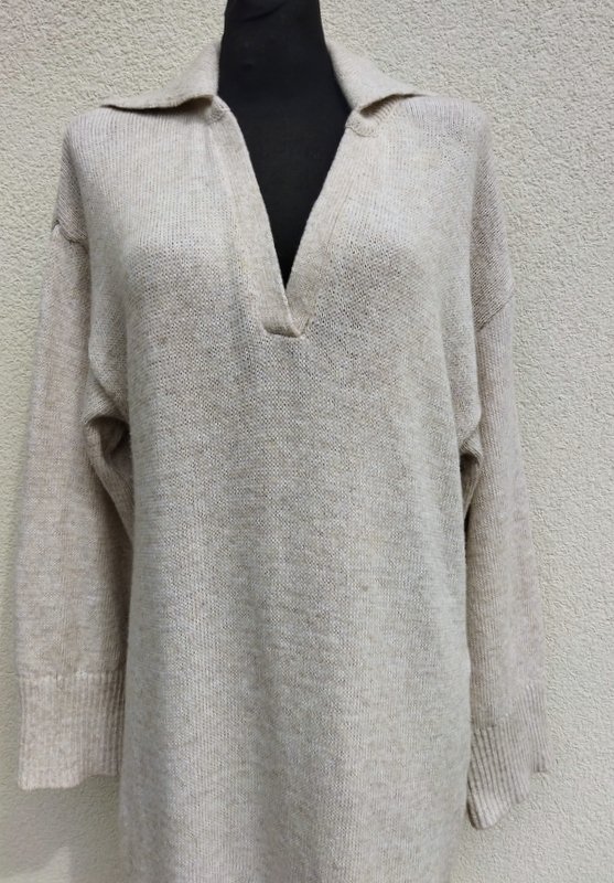 Dzianinowa sukienka o minimalistycznym uniwersalnym kroju w melanżowej kolorystyce jaśniutkiego chłodnego beżu. Z kołnierzykiem, z dekoltem V , z rozcięciami po bokach. Wykończona ściągaczami. Miła podatna i rozciagliwa