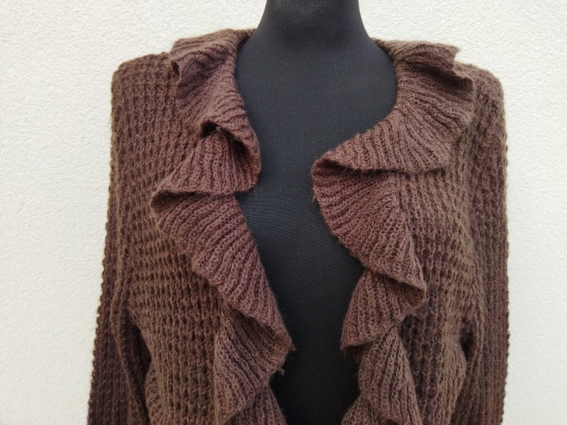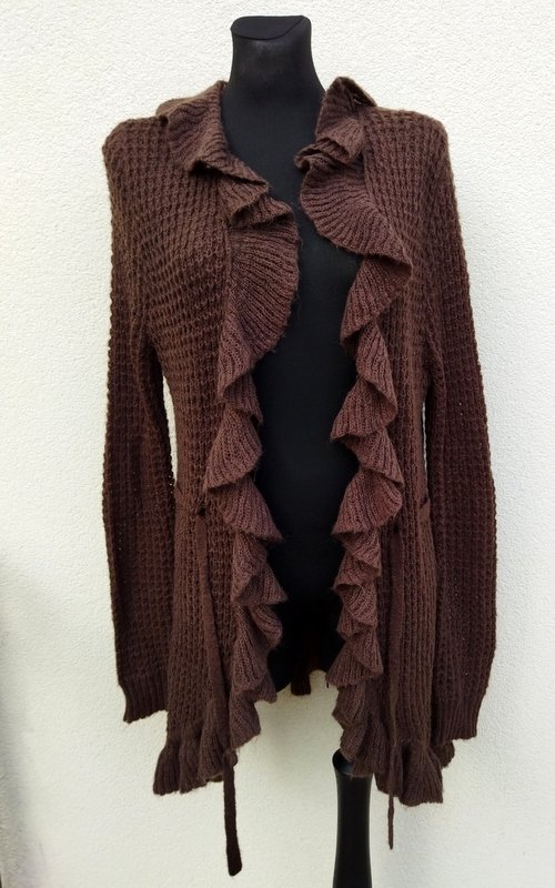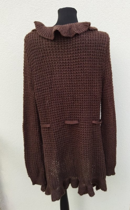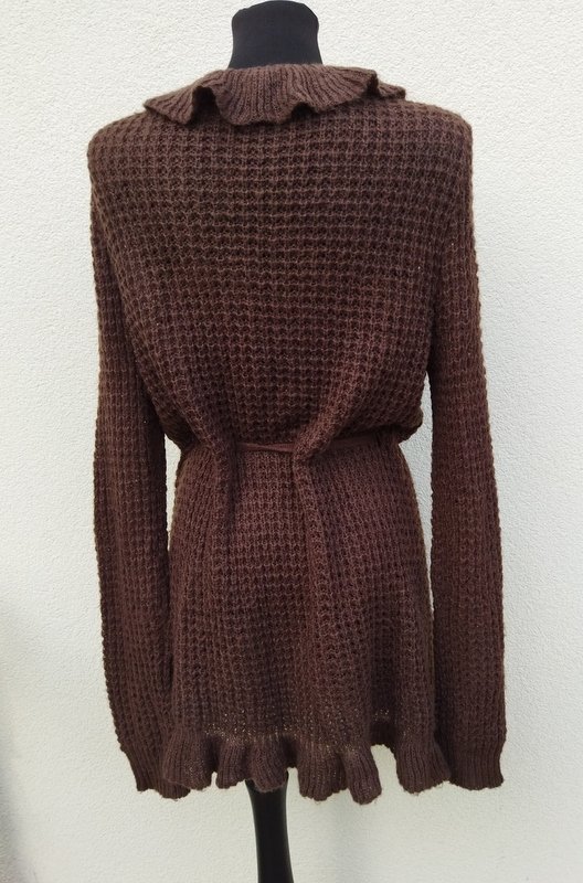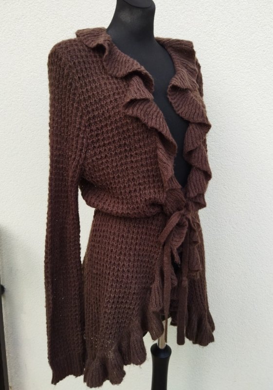 Dłuzszy sweter z akrylowej włóczki z nylonem, w kolorze gorzkiej czekolady. Wokół całego swetra ozdobna falbanka z tej samej dzianiny. Fason otwarty z możliwością wiązania na przeciągany w talii dzianinowy wąski pasek.