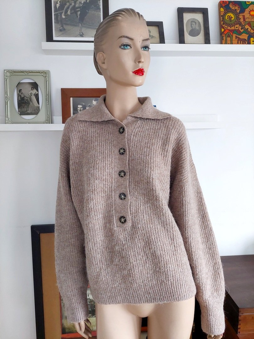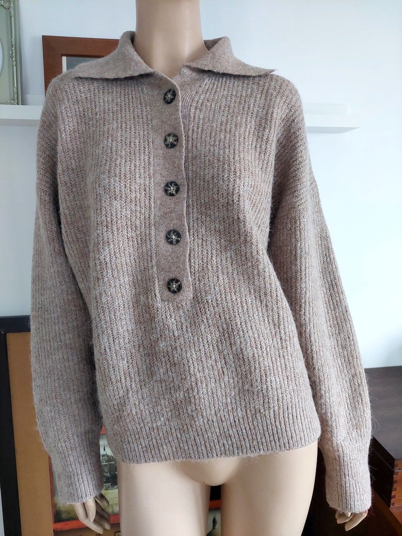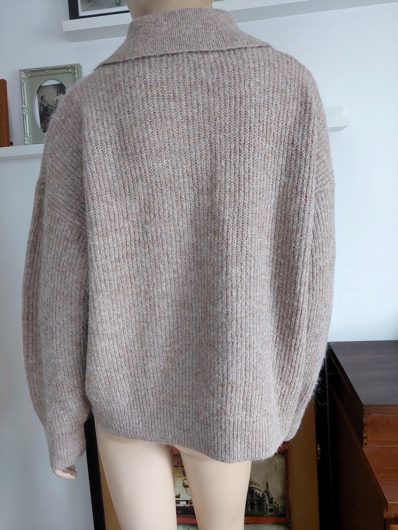 sweter marki ginatricot premium quality. fason prosty oversizowy, z obniżonym rękawem. Materiał 52% akryl 25% poliester 14% wełna 7% alpaka 2% elastan. rozmiar z metki XL. kolor chłodny beżowy. Na manekinie o rozmiarze małe 38, stan super w woreczku jest zapasowy guzik. Podaję wymiary mierzone na płasko;