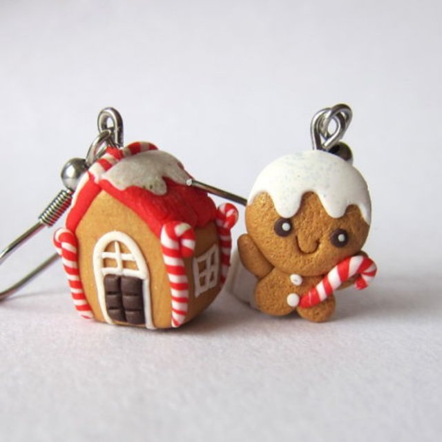 Zabawne kolorowe kolczyki wykonane ręcznie z masy termoutwardzalnej Fimo w kształcie piernikowego ludzika i chatki. Wielkość kolczyków to ok. 15 mm (35 mm z biglami). Bigle wykonane są ze stali chirurgicznej. Kolczyki świetne na prezent. Zobacz moją całą galerię w Decobazaar!