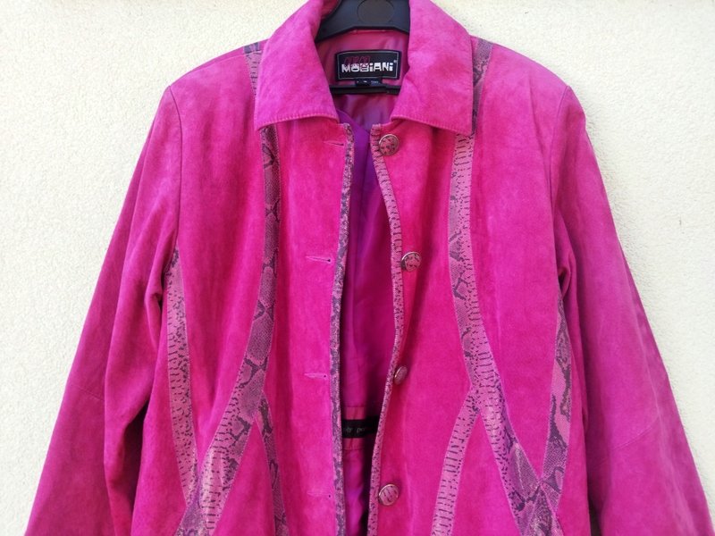 Wspaniała dłuższa kurtka lub płaszcz z naturalnej skóry w kolorze intensywnego różu ( fuksjowy odcień) łączona ze skórą w wężowy wzór. Z kołnierzem, z dwiema wpuszczanymi kieszeniami od strony zewnętrznej i dwiema od wewnątrz, z odwijanymi mankietami rękawów. . Zapinana na oblekane skórą guziki w metalowej srebrnej otoczce. Na podszewce. Miła, wygodna i bardzo lekka.