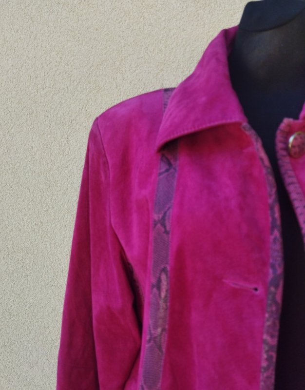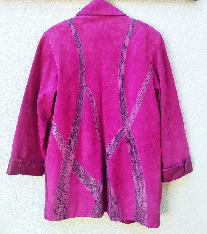 Wspaniała dłuższa kurtka lub płaszcz z naturalnej skóry w kolorze intensywnego różu ( fuksjowy odcień) łączona ze skórą w wężowy wzór. Z kołnierzem, z dwiema wpuszczanymi kieszeniami od strony zewnętrznej i dwiema od wewnątrz, z odwijanymi mankietami rękawów. . Zapinana na oblekane skórą guziki w metalowej srebrnej otoczce. Na podszewce. Miła, wygodna i bardzo lekka.