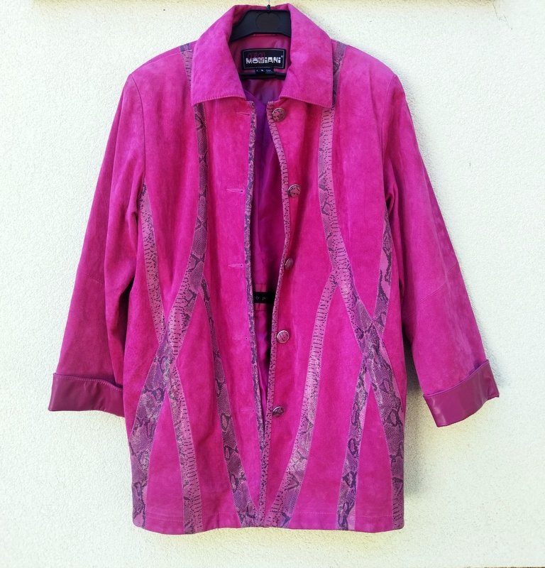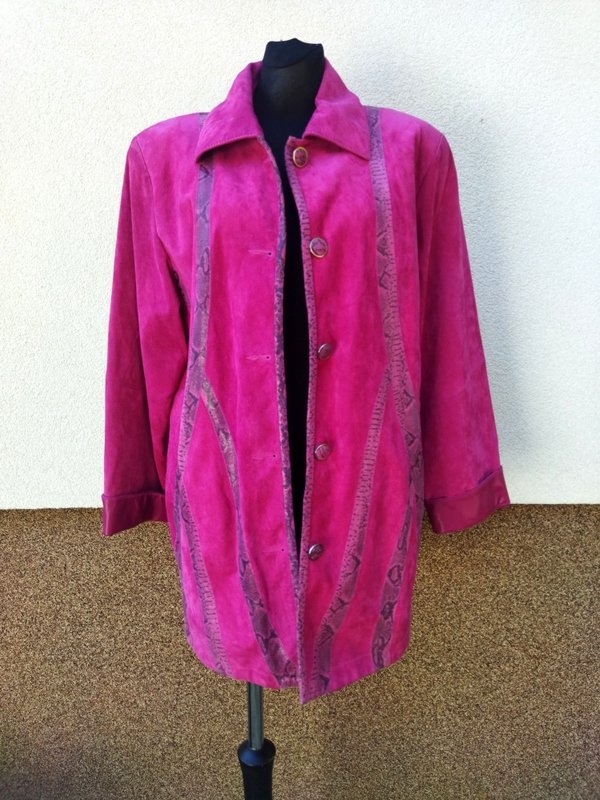 Wspaniała dłuższa kurtka lub płaszcz z naturalnej skóry w kolorze intensywnego różu ( fuksjowy odcień) łączona ze skórą w wężowy wzór. Z kołnierzem, z dwiema wpuszczanymi kieszeniami od strony zewnętrznej i dwiema od wewnątrz, z odwijanymi mankietami rękawów. . Zapinana na oblekane skórą guziki w metalowej srebrnej otoczce. Na podszewce. Miła, wygodna i bardzo lekka.