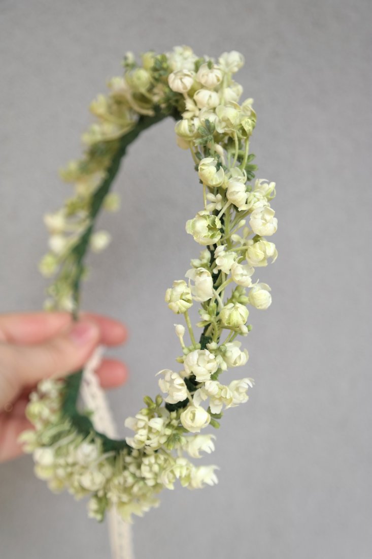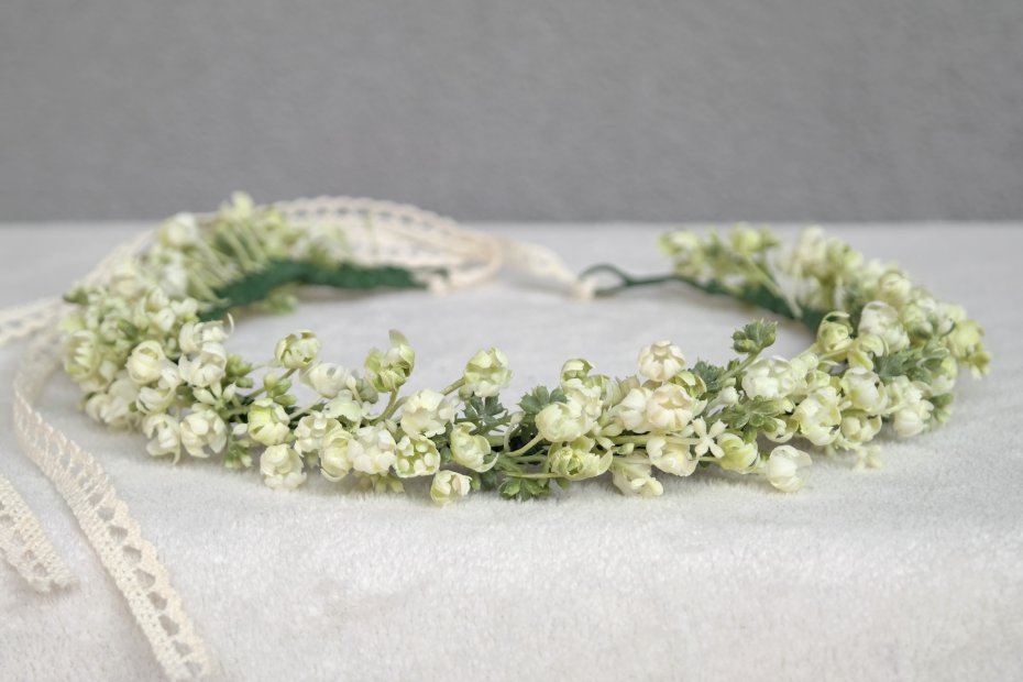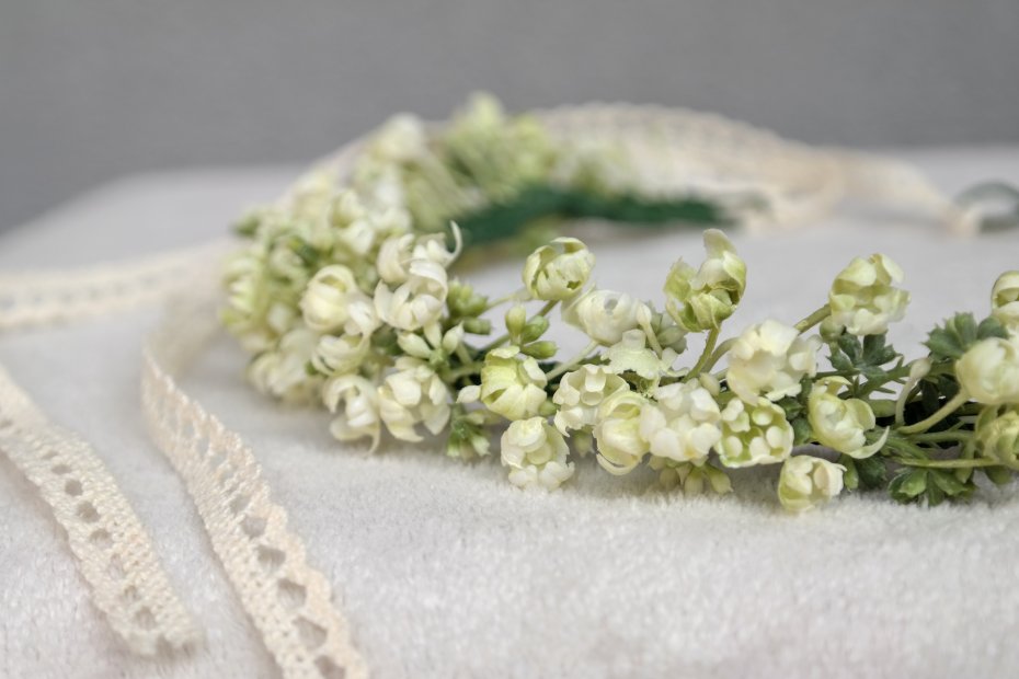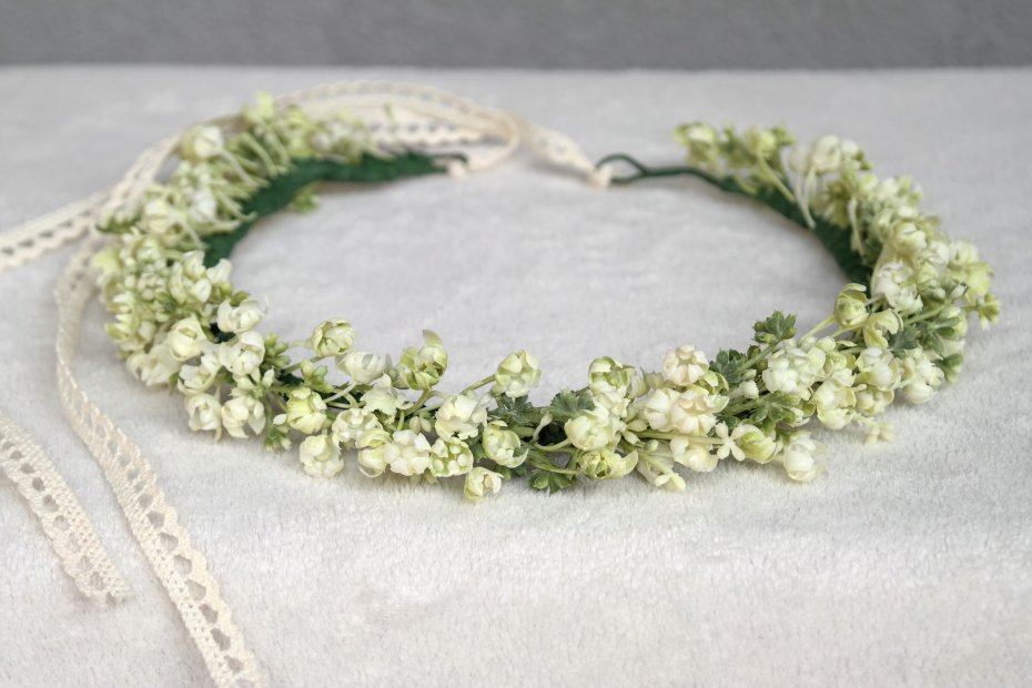 Kompozycja kremowo-zielonych kwiatuszków przypominających gipsówkę tworzy lekką, miękką formę – jakby została upleciona na spokojnej leśnej polanie. Wianek wygląda niezwykle subtelnie i świeżo, pięknie podkreślając urodę bez przytłaczania stylizacji.