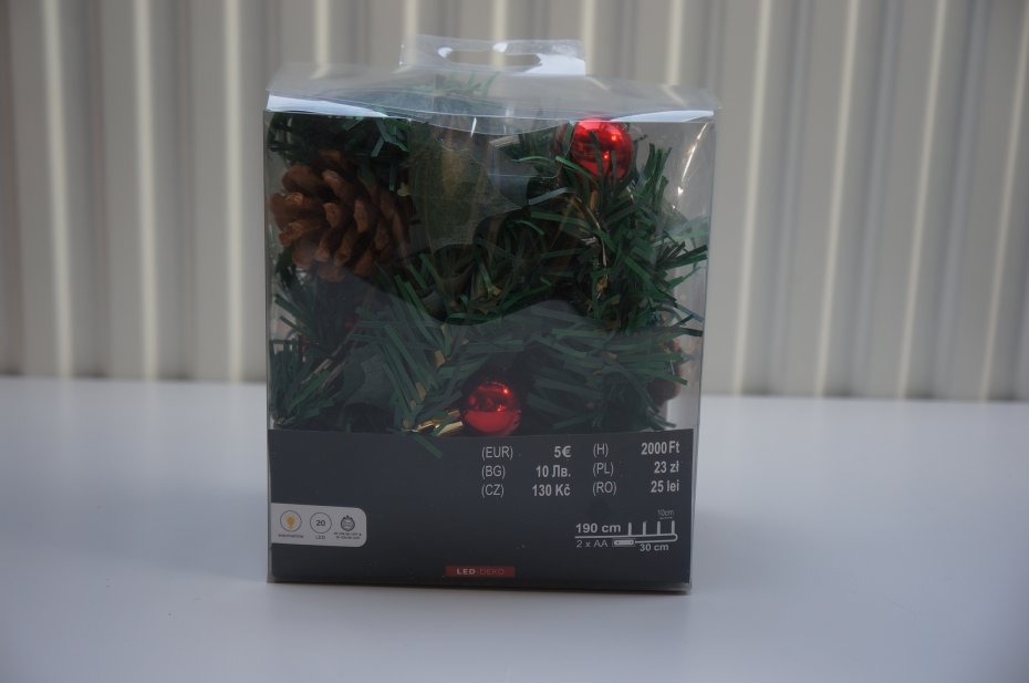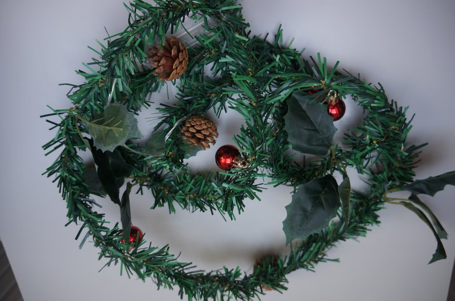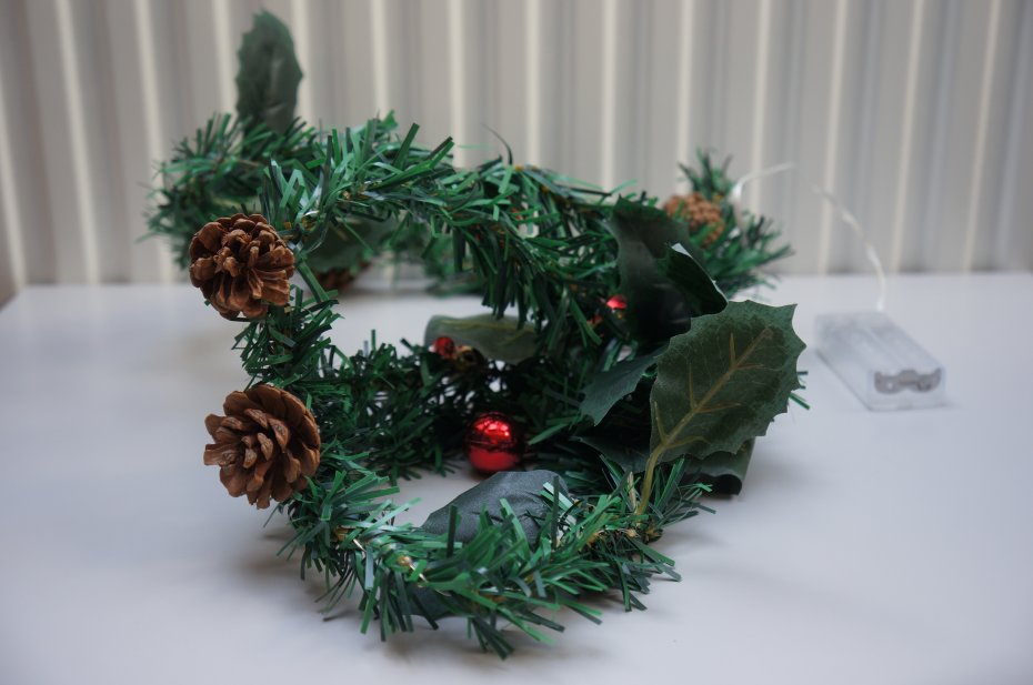 Bożonarodzeniowa girlanda LED. Ozdobiona małymi, czerwonymi bombkami, naturalnymi szyszkami i delikatnymi lampkami - barwa światła ciepło-biała. Dioda LED niewymienialna. Światełka girlandy zasilane są 2. bateriami AA 1,5V - nie dołączone do zestawu. Produkt przeznaczony do wnętrz. Nowy. Oryginalnie zapakowany. Stan bardzo dobry.
