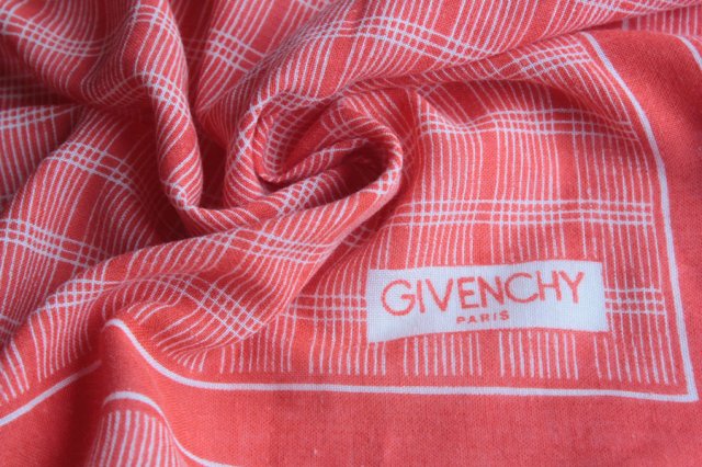 Przedstawiam Państwu luksusową chustę GIVENCHY w ponadczasowy wzór - delikatną kratkę w jasnym odcieniu czerwieni. Miękki materiał, jest to prawdopodobnie bawełna.