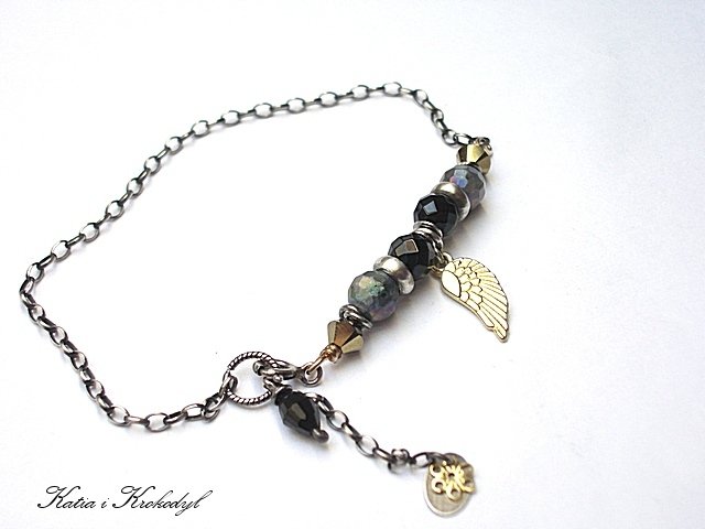 Delikatna bransoletka wykonana w ze srebra i srebra pokrytego 24k złotem [pr. 925] w połączeniu z fasetowanymi kuleczkami labradorytów mystic, fasetowanymi kuleczkami onyksów [6mm], kryształkami Swarovskiego oraz skrzydełkiem z mosiądzu [kolor nie ulega ścieraniu]. Minerały nawleczone na drut z mosiądzu. Srebro częściowo oksydowane i przetarte. Całkowita długość bransoletki około 19,5 cm plus 3,5 cm ozdobnej przedłużki. Biżuteria ozdobnie zapakowana.