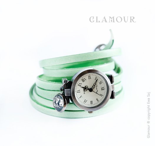 Oryginalna bransoletka - zegarek z kolekcji Glamour. Skórzany rzemyk w kolorze miętowym szeroki na 5 mm sześciokrotnie owija nadgarstek. Zapięcie umożliwia regulację szerokości. Pasuje najlepiej na nadgarstek 13-17 cm. Ale można ją dopasować również do grubszego nadgarstka - owijając rzemyk pięciokrotnie. Wielkość tarczy zegarka 25 mm, średnica charmsa 12 mm. Charms i zegarek w kolorze antycznego złota.