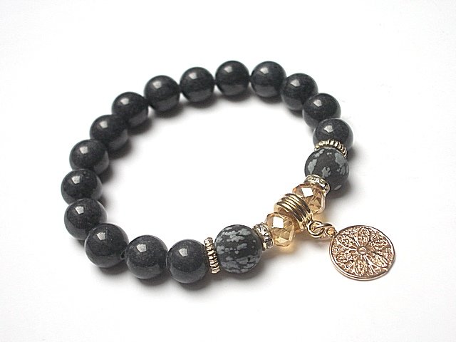 PROJEKT AUTORSKI. WŁASNOŚĆ KI-KA. KOPIOWANIE ZABRONIONE. Bransoletka wykonana z naturalnych kamieni: jadeity [10mm], obsydian matowy [10mm], kryształków fasetowanych [8mm] oraz elementów metalowych w kolorze różowego złota. Bransoletka na gumce silikonowej. Pasuje na nadgarstek 16-17cm. Biżuteria ozdobnie zapakowana. Możliwość dopasowania bransoletki do nadgarstka - wcześniej prosimy o kontakt.