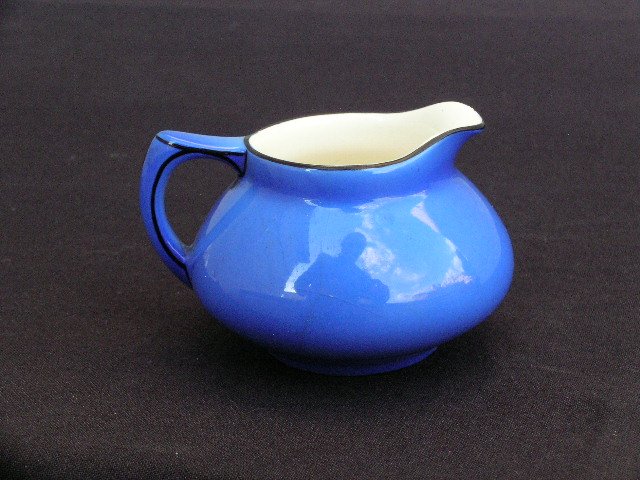 Wyjątkowo oryginalny mały dzbanuszek na śmietankę, w pięknych proporcjach i małej wielkości odsłonie, na błyszcząco szkliwiony w cudnej niebieskości. Wewnątrz śmietanowo biały. Sygnowany Crown Ducal, angielski. Szerokość i pękatość 7,5; wysokość 5 cm. Naprawdę ciekawy :) Stan zachowania bardzo dobry.