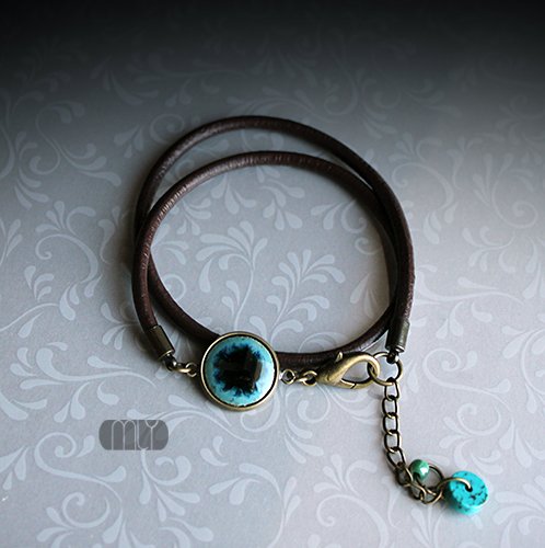 Efektowna bransoletka wykonana z rzemienia jubilerskiego w kolorze brązowym, elementów w kolorze starego złota i ręcznie wykonanej ceramicznej zawieszki, szkliwionej mieszanką zielonych szkliw z efektem plamek o subtelnym połysku, Obwód regulowany. Polecam