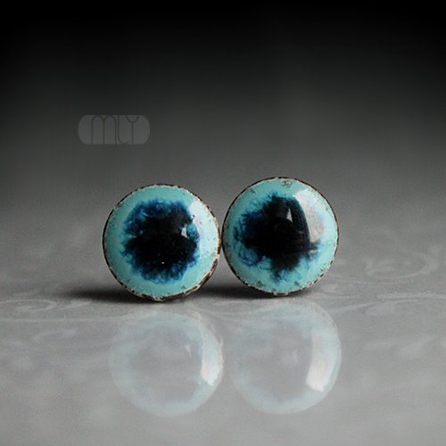 Ceramiczne lekko nieregularne kolczyki w formie sztyftów, ręcznie wykonane z delikatnej gliny kamionkowej, jednostronnie szkliwione błękitnym i zielonym szkliwem, na antyalergicznych sztyftach w kolorze srebrnym.Średnica ok.11mm. Polecam