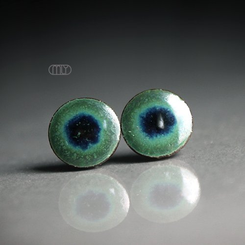 Ceramiczne lekko nieregularne kolczyki w formie sztyftów, ręcznie wykonane z delikatnej gliny kamionkowej, jednostronnie szkliwione błękitnym i zielonym szkliwem, na antyalergicznych sztyftach w kolorze srebrnym.Średnica ok.11mm. Polecam