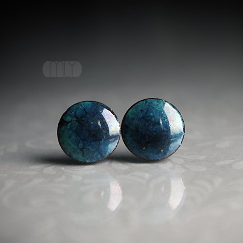 Ceramiczne lekko nieregularne kolczyki w formie sztyftów, ręcznie wykonane z delikatnej gliny kamionkowej, jednostronnie szkliwione błękitnym i zielonym szkliwem, na antyalergicznych sztyftach w kolorze srebrnym.Średnica ok.11mm. Polecam