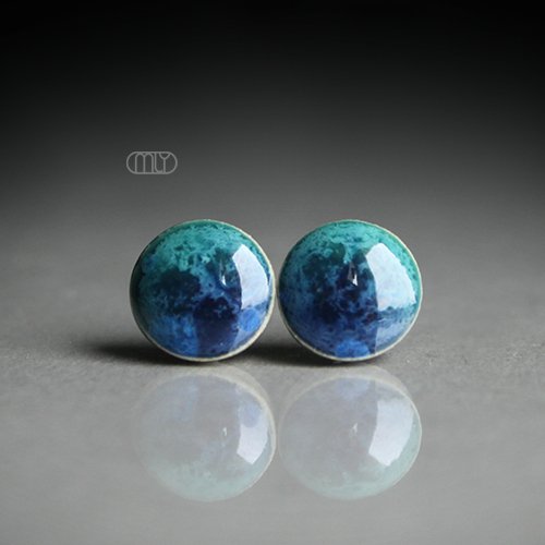 Ceramiczne lekko nieregularne kolczyki w formie sztyftów, ręcznie wykonane z delikatnej gliny kamionkowej, jednostronnie szkliwione błękitnym i zielonym szkliwem, na antyalergicznych sztyftach w kolorze srebrnym.Średnica ok.9mm. Polecam