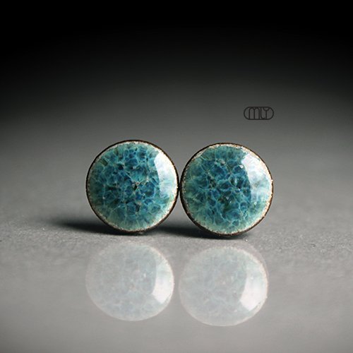 Ceramiczne lekko nieregularne kolczyki w formie sztyftów, ręcznie wykonane z delikatnej gliny kamionkowej, jednostronnie szkliwione błękitnym i zielonym szkliwem, na antyalergicznych sztyftach w kolorze srebrnym.Średnica ok.9mm. Polecam