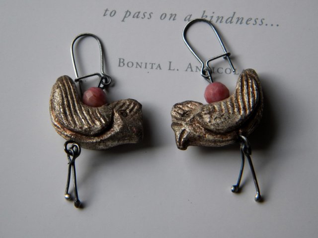 Kolczyki z oksydowanego srebra 925,rodonitów i glinianych kurek Kurki pokryte płatkami srebra (technika pozłotnicza) długośc całkowita 5,4cm rozpietość kurki 2,9cm