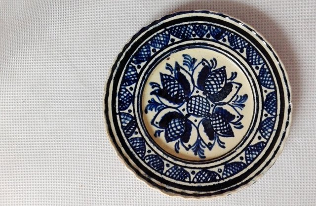 Talerz wykonany ręcznie z gliny, malowany i szkliwiony z przodu. Z tyłu zawieszka.