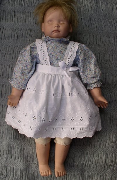 Lalka kolekcjonerska na metce napis original GLOREX na główce napis,ostatni człon SYSA.Lalka śpiąca z jasnymi rzęsami.Włoski miękkie,blond.Główka,końcówka nóg i rąk z porcelany.Tułów razem z nogami z materiału,wypełnienie miękkie.Brak spodenek.Ubrana w sukieneczkę i fartuszek.Stan ogólny dobry+.Wysokość 50 cm.