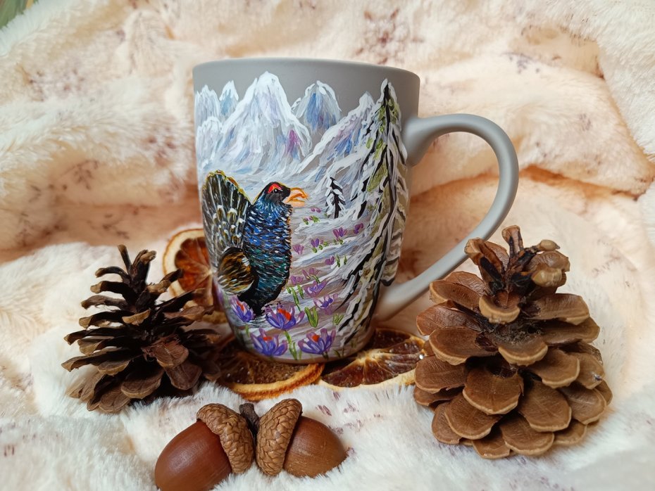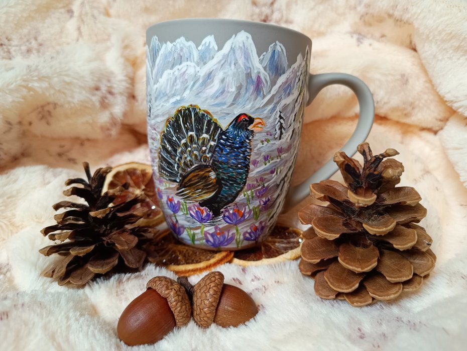 Kubek z głuszcem na polanie z tłem przepięknego pejzażu górskiego zachęcającego do odpoczynku, chwilowego zatrzymania, relaksu, powrotu w góry. Natura w tajemniczym i nieodkrytym jeszcze miejscu.