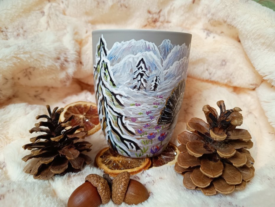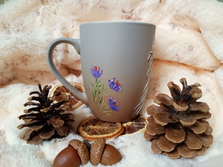 Kubek malowany wiele godzin z wielką troską o wszelkie szczegóły z miłości do natury, z miłości do tego co piękne i ulotne..