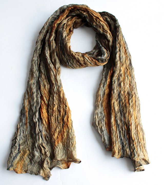 Duży szal o gniecionej fakturze we wzory w odcieniach miodu i oliwki. Materiał to prawdopodobnie jedwab.