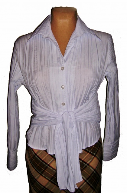 Śliczna biała bluzka z zagniatanego materiału (widoczne na zdjęciu)w rozmiarze L. Bluzka w pasie ma wszyty biały szeroki pas materiału wiązany z przodu - ozdobny szal. Bluzka ma krój prosty. Stan bardzo dobry. Materiał - bawełna. Gorąco polecam.