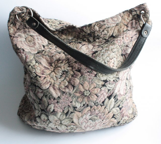 Pojemna gobelinowa torba na podszewce. Pasek wykonany ze skóry, nosi lekkie ślady użytkowania widoczne na zdjęciach.