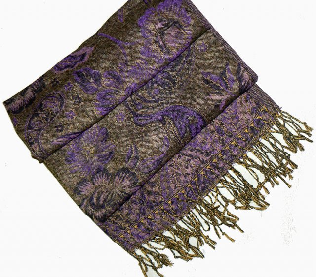Duży szal z mięsistej tkaniny o misternym gobelinowy splocie. Dwustronny, o odwróconych kolorach. Wykończony frędzlami.
