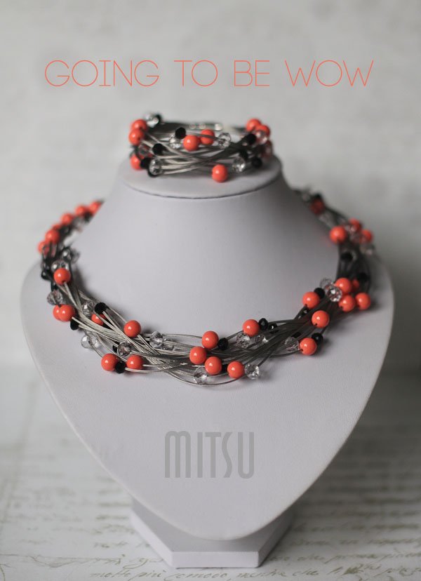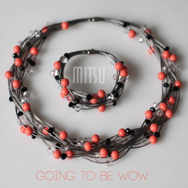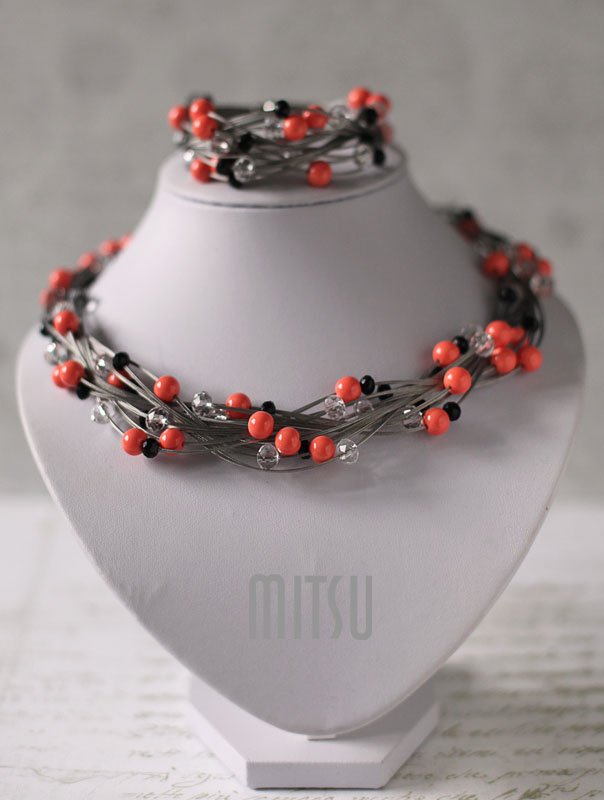 Wykonany z jubilerskiej linki i koralików w kolorze koralowym, czarnym i kryształowym.