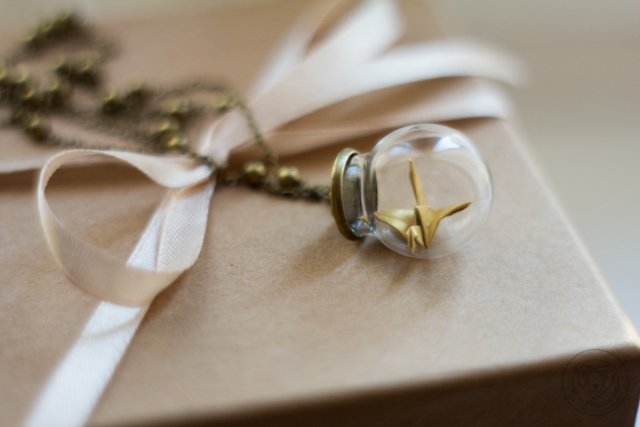 Delikatny, maleńki, papierowy żuraw - japoński symbol szczęścia, zdrowia i pokoju. Podobno, jeśli w jakiejś intencji złoży się tysiąc żurawich figurek, to życzenie się spełni. My spełniamy życzenia tym zjawiskowym wisiorkiem. Papierowy żuraw ukryty w szklanej kuleczce o najszerszej średnicy 2 cm. Część ozdobna zawieszona na łańcuszku o długości 37 cm. Całość w kolorze starego złota/brązu.