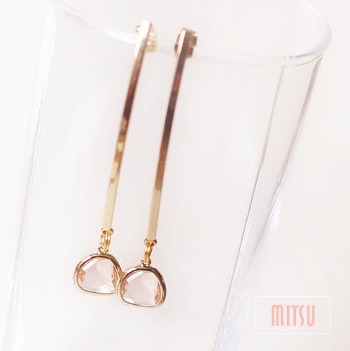 Elegancja i Ekstrawagancja, w parze która na pewno będzie zauważona. Kolczyki wykonane z brązu platerowanego 16 karatowym złotem i fasetowanego szkła o barwie transparentnej brzoskwini. Mierzą ok 6,4 cm. Kolczyki można zamówić również z kryształem czarnym lub miętowym.