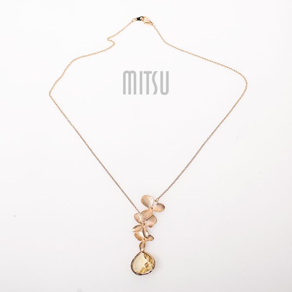 Delikatny ale wyrazisty naszyjnik, zbudowany z listów , drobniutkiego łańcuszka oraz kryształu. Naszyjnik jest wykonany z brązu platerowanego 16 karatowym złotem. Posiada lśniącą teksturę. Mierzy 42,5 cm plus 3 cm wisiorek - jeden listek i kryształ. Kryształ mierzy 15 x 18 mm i ma odcień cytrynu. Naszyjnik podróżuje ładnie zapakowany.