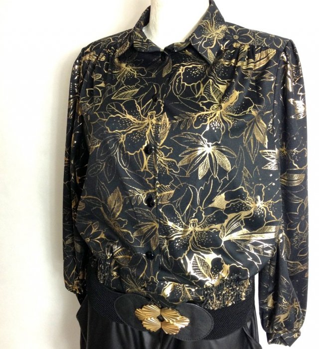 Bluza typu bomber w kolorze czarnym w złote kwiaty, zapinana na guziczki, rękawy i dół wykończone ściągaczem. Wykonana jest z delikatnie elastycznej, ale zwartej tkaniny.