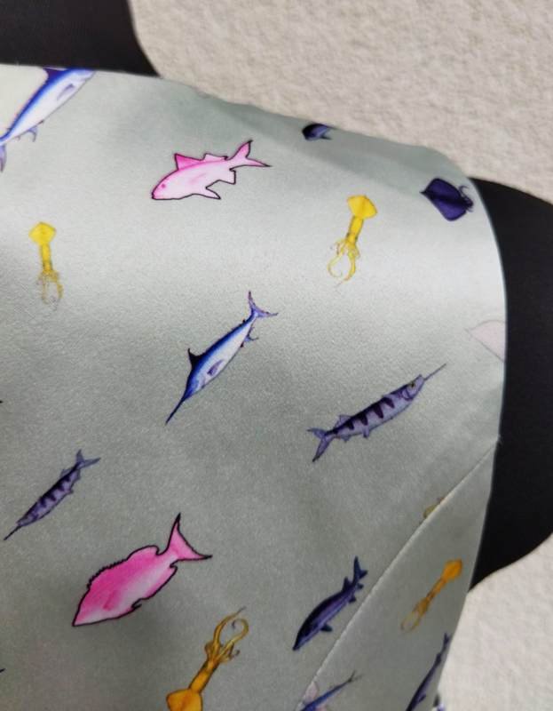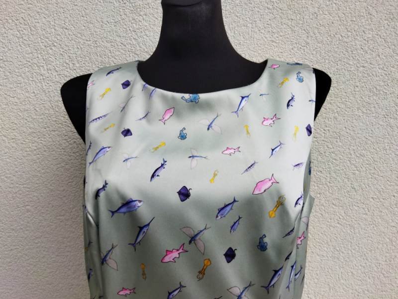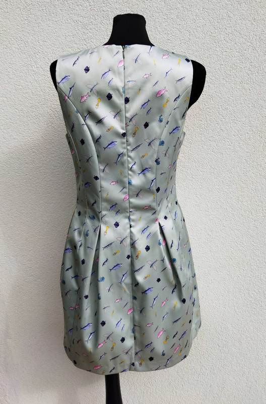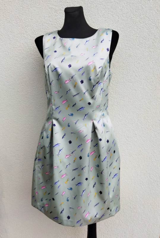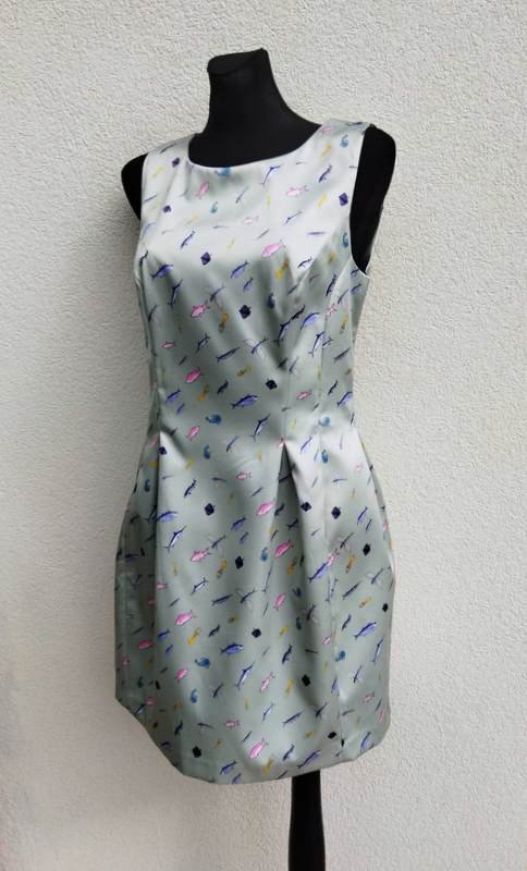 Śliczna sukienka z grubszej tkaniny poliestrowej z lekko satynowym połyskiem w miętowym kolorze z oceaniczna scenerią. Góra dopasowana dołem rozszerzona z przodu i z tyłu dwiema kontrafałdami umieszczonymi w szwach środkowych . Zapinana z tylu na długi zamek Bez podszewki. Ładniejsza w realu.