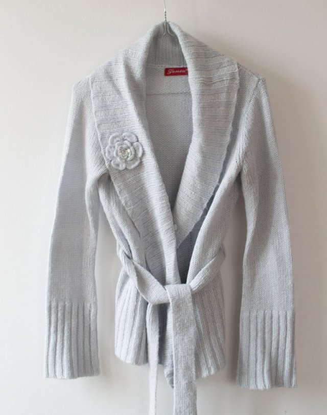 Miękki sweterek z paskiem, zdobiony kwiatem na kołnierzu.