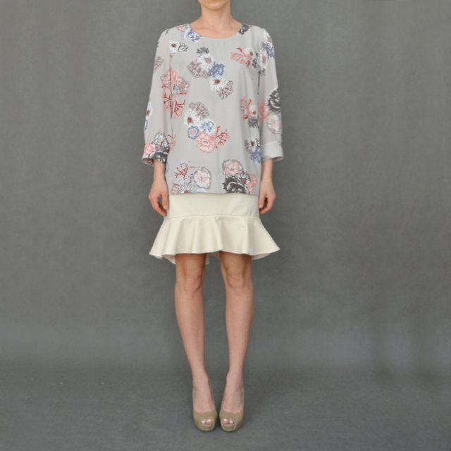 Bluzeczka w gołębim kolorze w kwiaty. Z tyłu złoty zip. Rękawki 3/4.