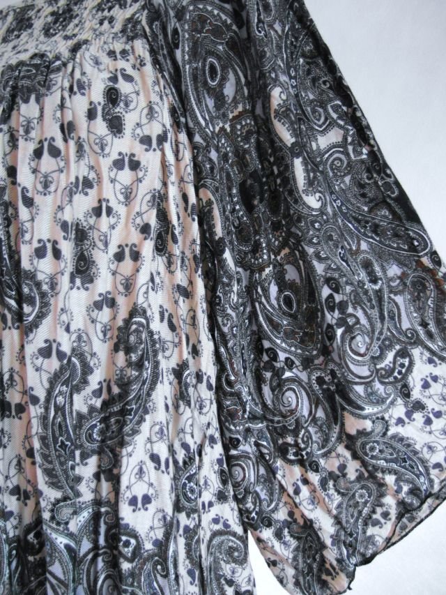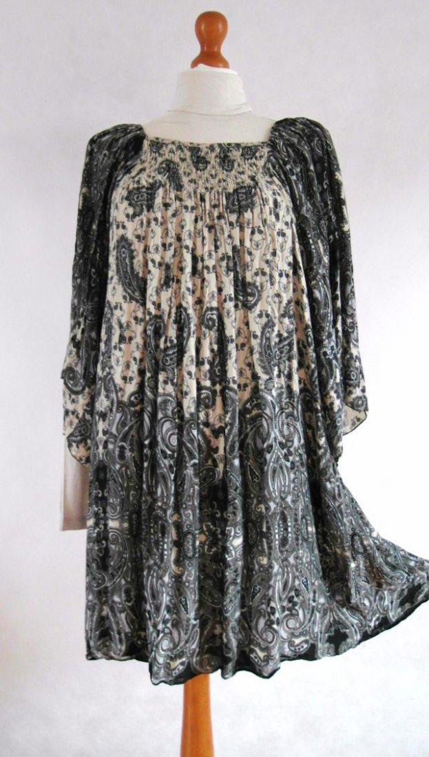 stonowana w kolorach - beż, szarości, brąz i gołębi.Wzor paisley.Dekolt w gumeczki, rozszerzona, luźna, tańcząca.Rękawy również szersze.