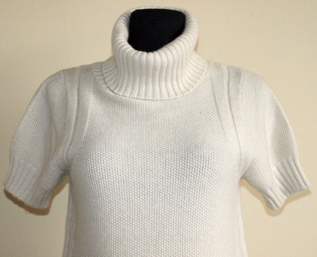 Golf w kolorze ecru, materiał 51% polyamid, 39% akryl i 10% angora, dlatego taki miły w dotyku. Stan bardzo dobry. Rozmiar z metki S, ale wg. mnie zdecydowanie większy, ponieważ włóczka jest rozciągliwa, a szerokość na samym dole dość duża. Prezentowany na manekinie o rozmiarze 38. Podaję wymiary mierzone na płasko;